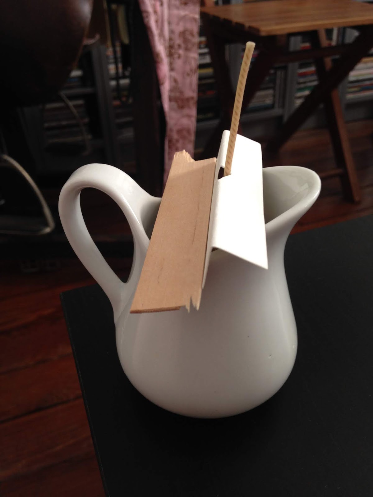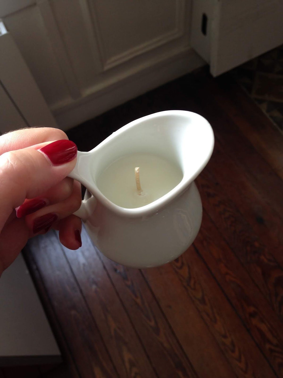 Évidement quand on fait sa maligne à venir avec un récipient d'une forme atypique, on bricole une cale avec un bout de bois pour garder la mèche au centre. Système D... Une petite tasse à café bien ronde et bien symétrique n'aurait pas posé ce problème ^^