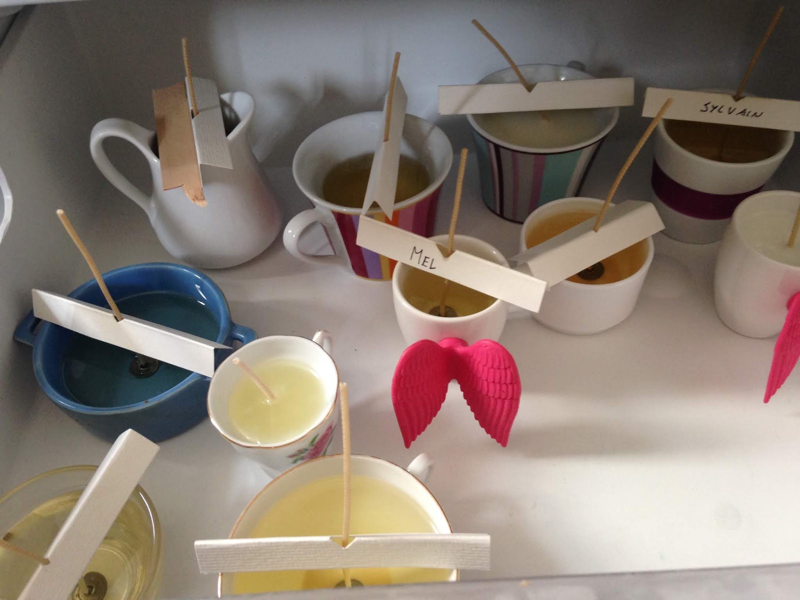 Un quart d'heure, le temps de créer une série de galets de massages destinés aux prochains ateliers d'Erosphère, et nos bougies sont déjà solidifiées, prêtes à être emportées sans risque de les renverser.